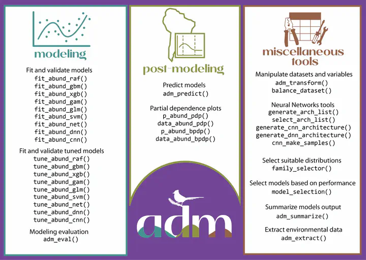AbstractAbundance-based species distribution models (ADM) correlate species abundance with environmental data to model and project abundance throughout space or time. This promising and still developing technique has gained significant attention in recent years.Here, we present the adm R package developed to support the construction of ADM, including data preparation, model fitting, prediction and model exploration. This package offers several modelling approaches (i.e. algorithms) that can be fine-tuned and customized. Models can be predicted in geographic space and explored regarding performance and response curves. Because modelling workflows in adm are constructed based on a combination of distinct functions and simple outputs, adm can be easily integrated into other packages. To illustrate this, we constructed a full modelling procedure for the shrub species Cynophalla retusa using adm.To date, adm provides 35 functions in three categories, (i) modelling: to tune, fit and validate models with nine different algorithms, with a suite of possible model-specific hyperparameters; (ii) post-modelling: to predict abundance across space and construct partial dependence plots to explore the relationships between abundance and environmental predictors; and (iii) miscellaneous tools: to support the workflow in all steps, including data handling, transformations and hyperparameter selection.With adm, we intend to provide a flexible, straightforward and concise toolbox for ADM construction and expect it to help users develop and leverage the promising ADM field.